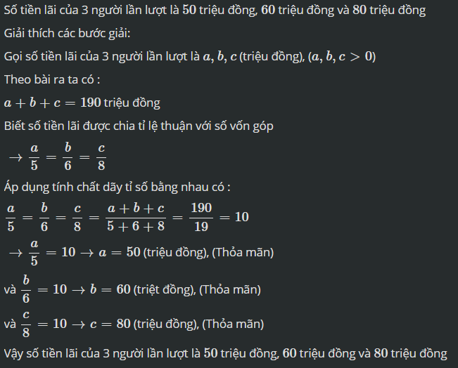 Ba người bạn góp vốn kinh doanh theo tỉ lệ 5,6,8 cuối năm thu được 190 triệu tiền lãi. Hỏi mỗi người được chia bài nhiêu tiền lãi. Biết rằng số tiền lãi tỉ lệ thuận với số tiền vốn đã góp