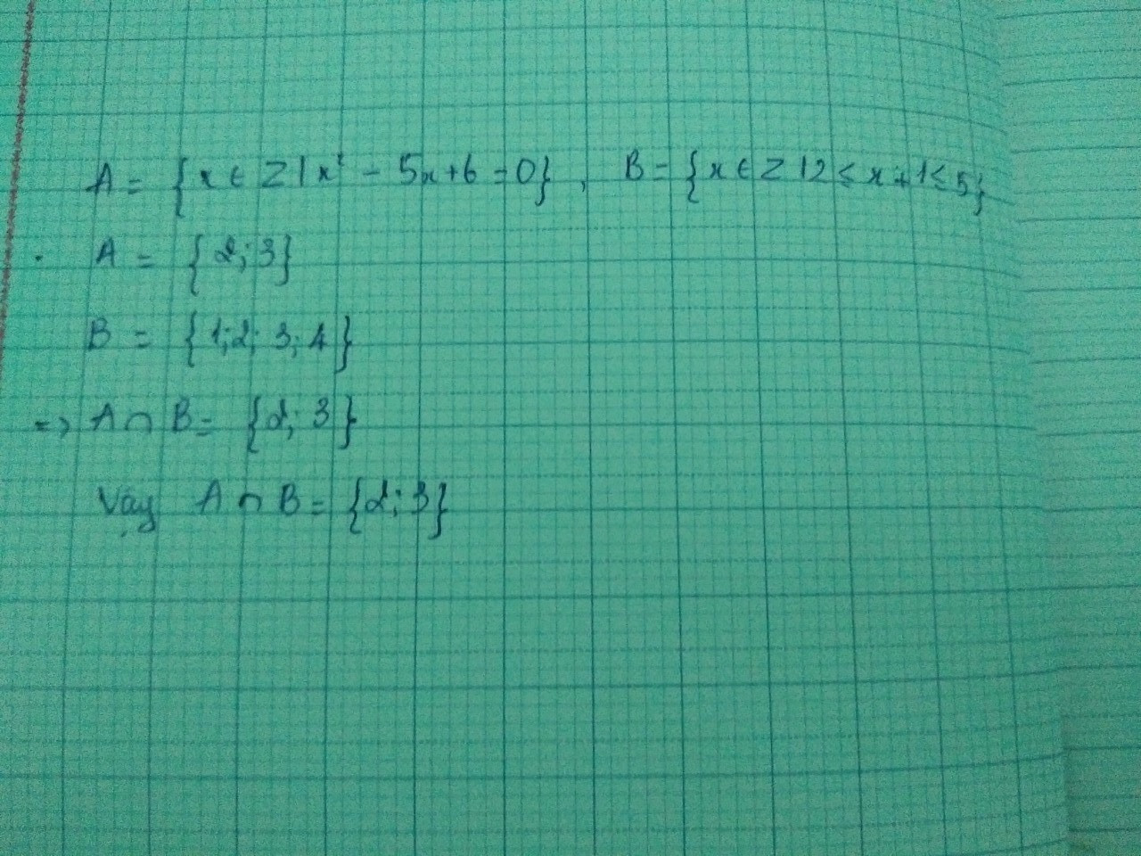 Cho 2 tập hợp A={x€Z | x^2-5x+6=0} , B={ x€Z | 2<=x+1<=5 } Tìm A giao B ?
