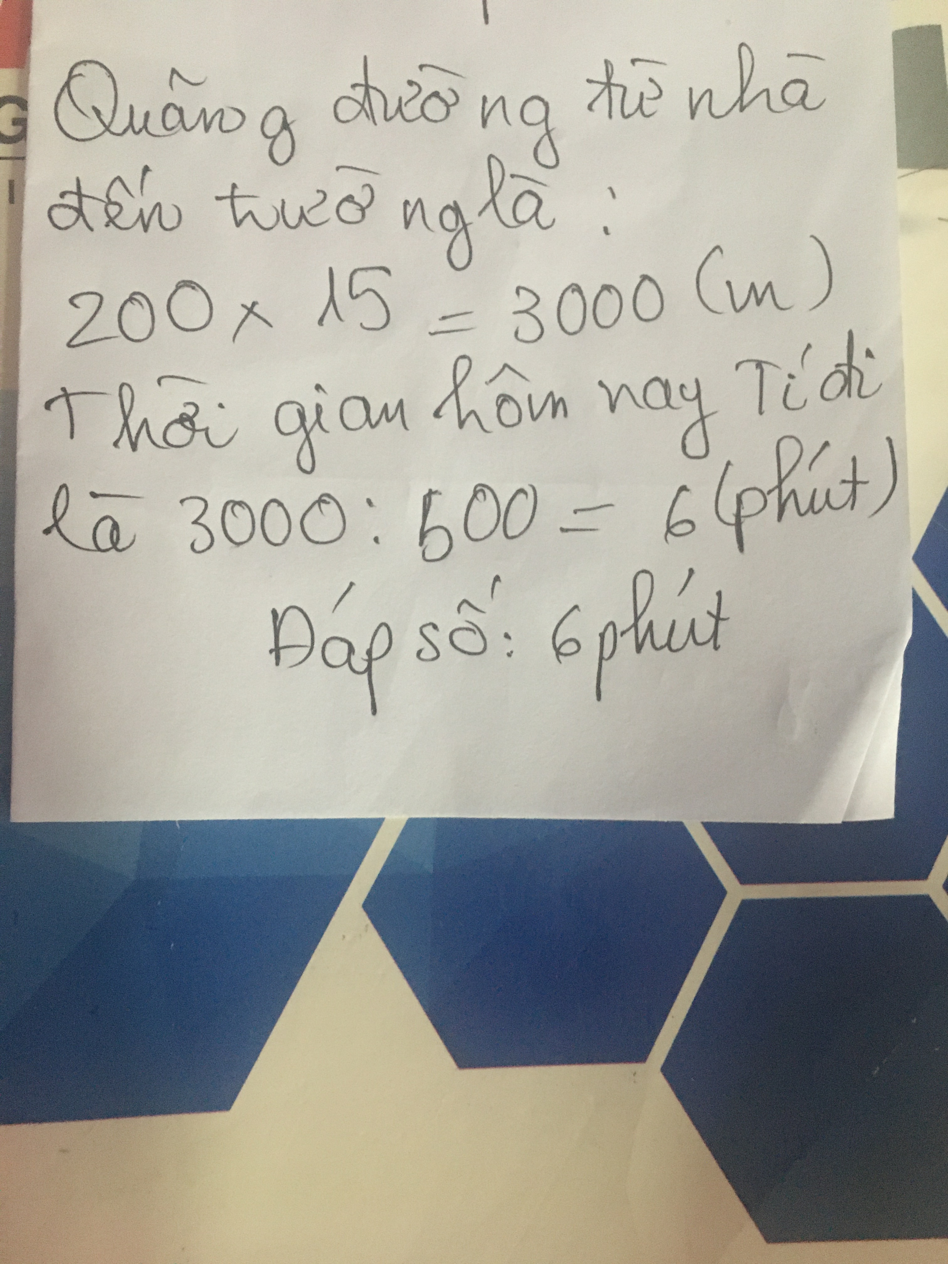 Hằng ngày, tí được mẹ đưa đi học bằng xe đạp từ nhà đến trường,mỗi phút đi được 200 m thì hết 15 phút.hôm nay, bố chở tí đến trường bằng xe máy,mỗi phút đi được 500 m. Hôm nay tí đi học từ nhà đến trường mất bao nhiêu lâu?