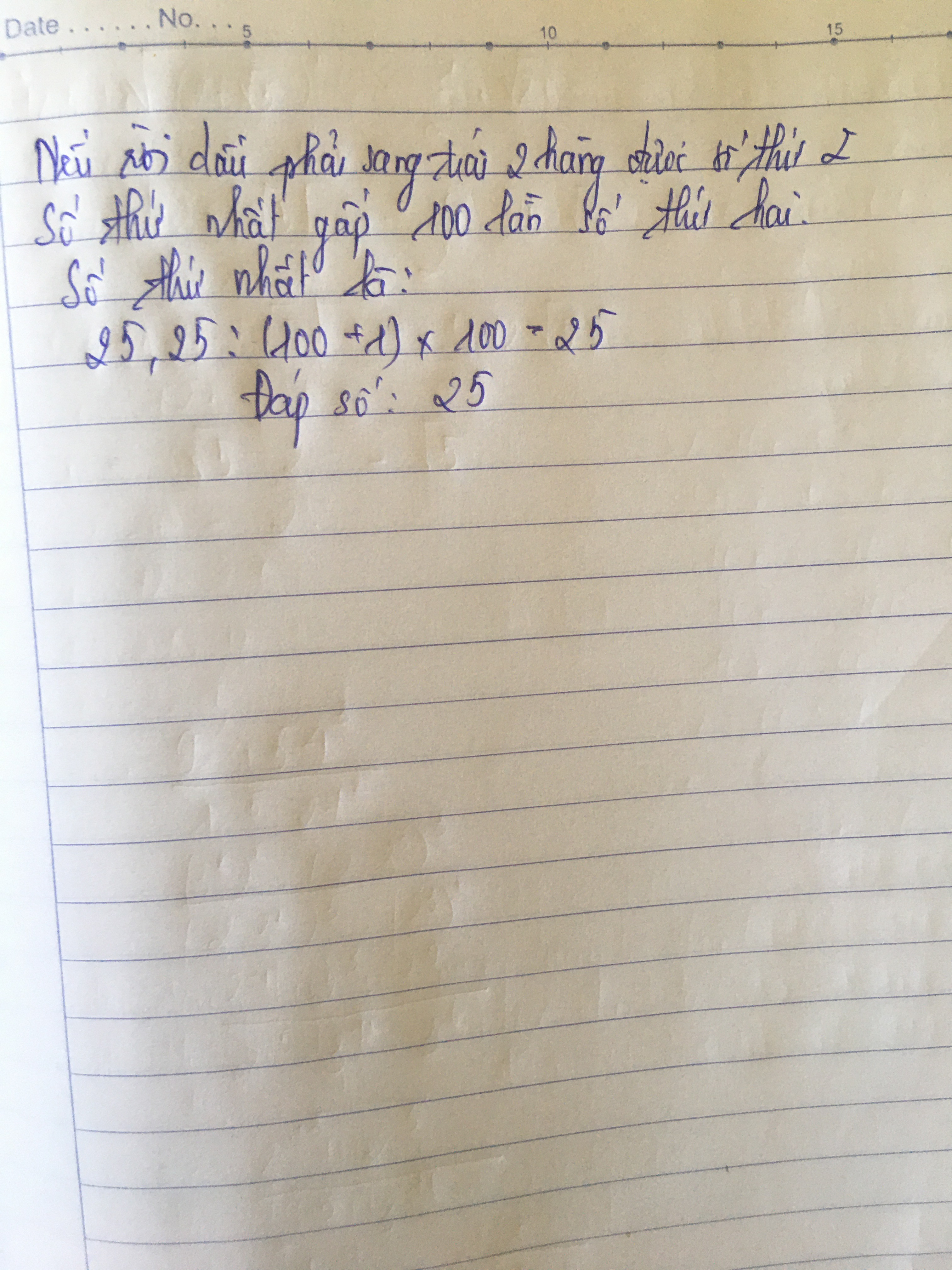 Tổng của hai số là 25,25.Tìm số thứ nhất.Biết rằng nếu dời dấu phẩy sáng bên trái 2 hàng thì được số thứ hai