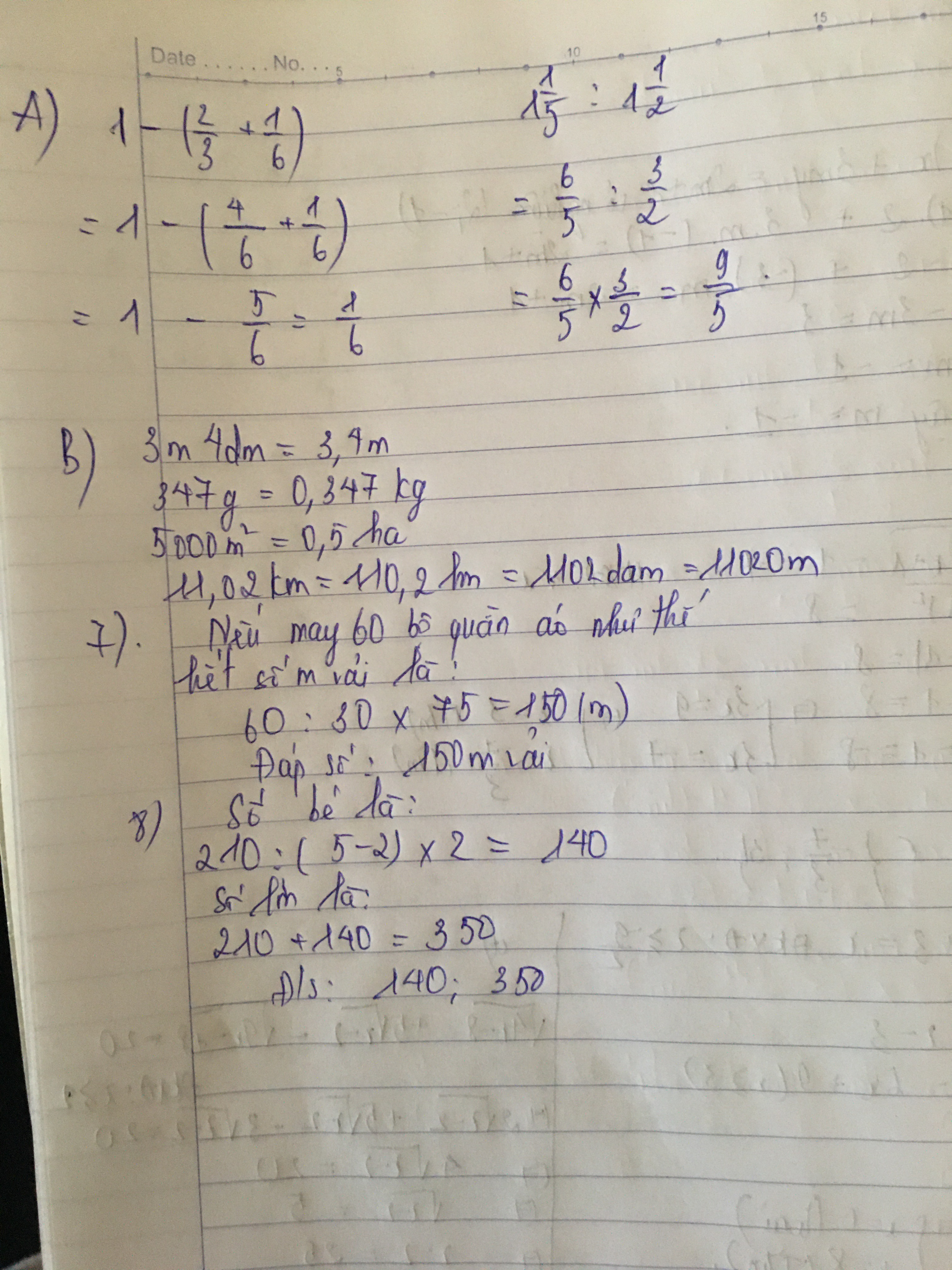 A) 1-(2/3+1/6) ; 1 và 1/5 : 1 và 1/2