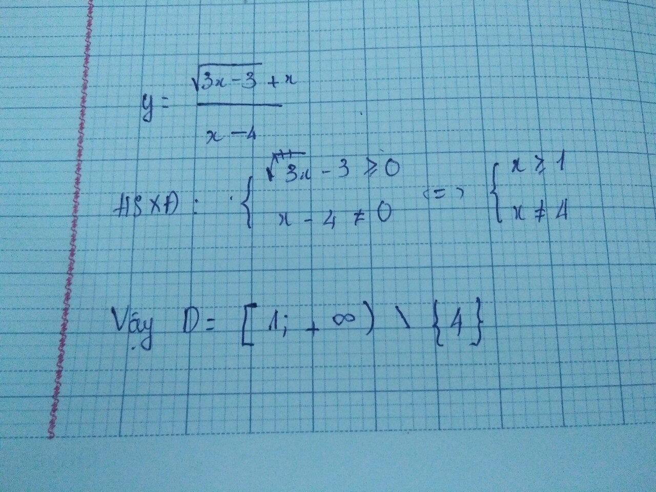 Tập xác định của hàm số y = Căn bậc 2 của 3x-3 cộng x trên x-4 là ?