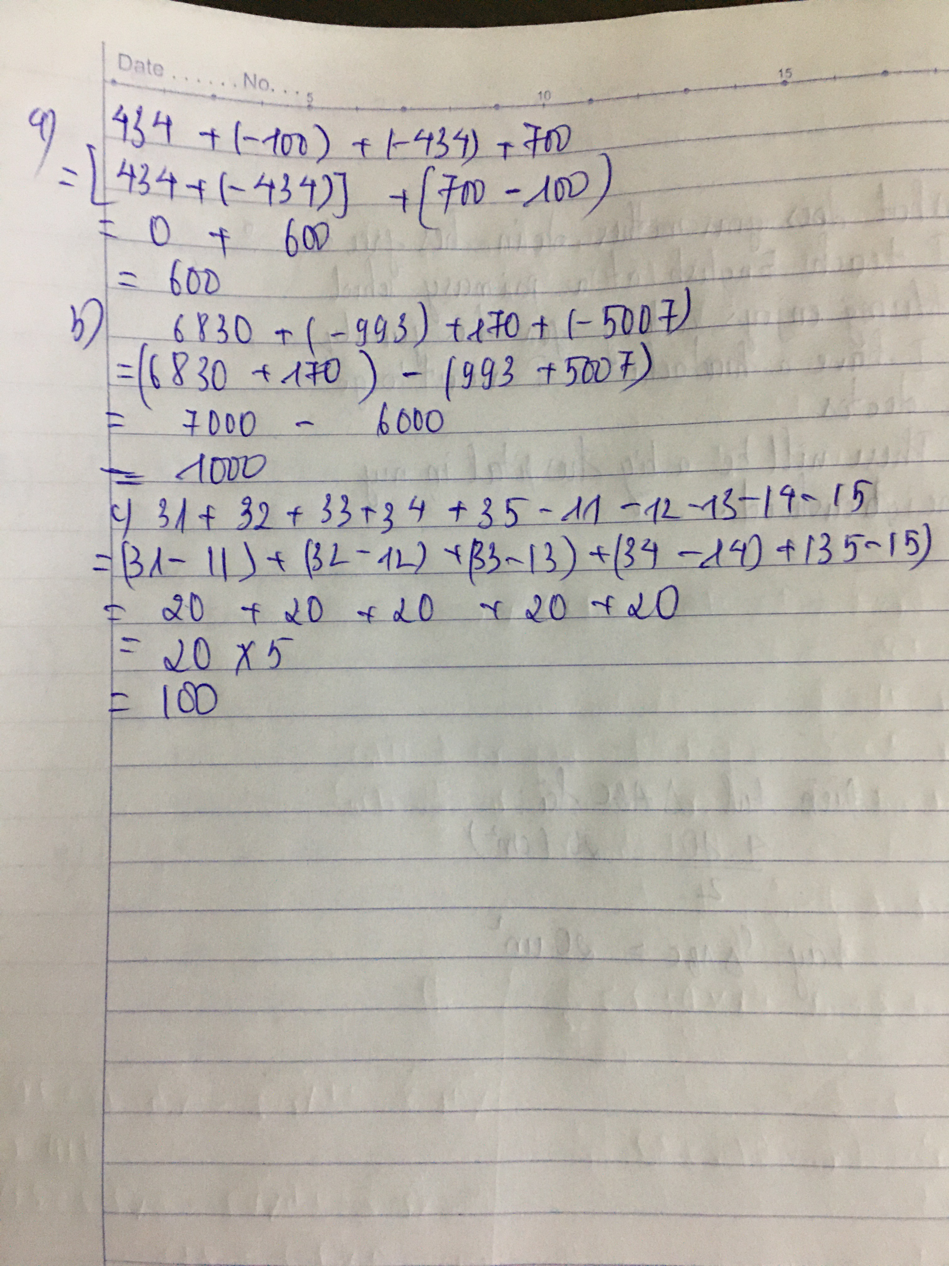 6. Thực hiện các phép tính sau một cách hợp lí a ) 434 + ( -100 ) + ( -434 ) + 700 ; b ) 6830 + ( -993 ) + 170 + ( -5007 ) ; c ) 31 +32 +33 +34 + 35-11-12-13-14-15 .