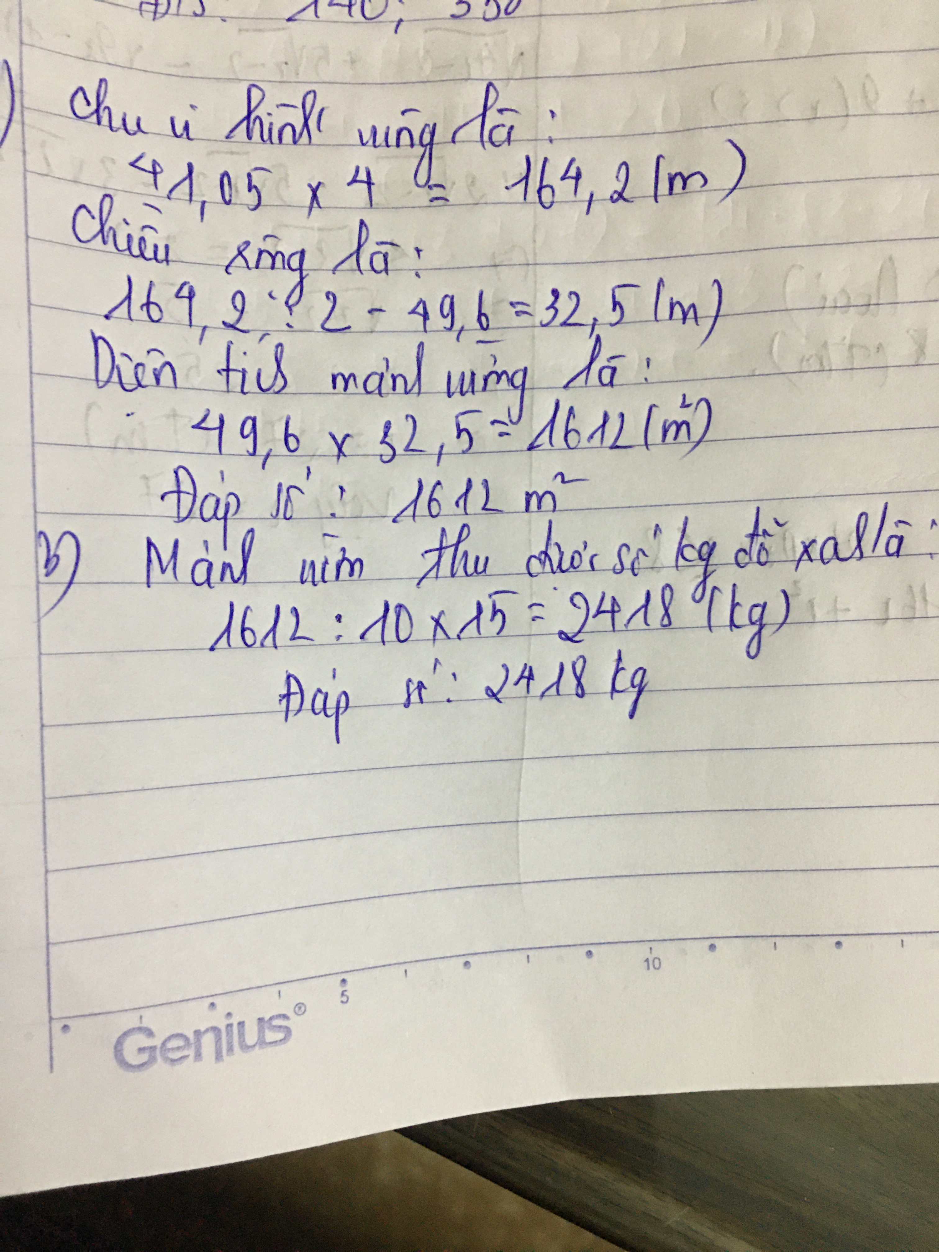 b) Biết rằng cứ 10m2 thì thu được 15kg đỗ xanh. Hỏi cả mảng vườn thu được bao nhiêu ki-lô-gam đỗ xanh ?