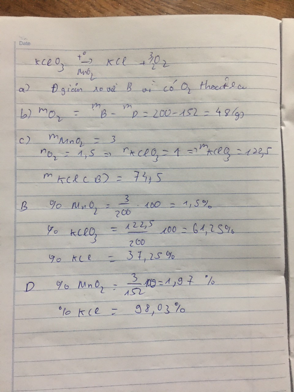 Trộn 3 gam MnO2 (là chất xúc tác phân hủy KClO3) vào 197 gam hỗn hợp A gồm KCl và KClO3 được 200 gam hỗn hợp B Nung hỗn hợp B đến khi phản ứng xảy ra hoàn toàn (hiệu suất phản ứng 100%) thu được chất rắn D nặng 152g