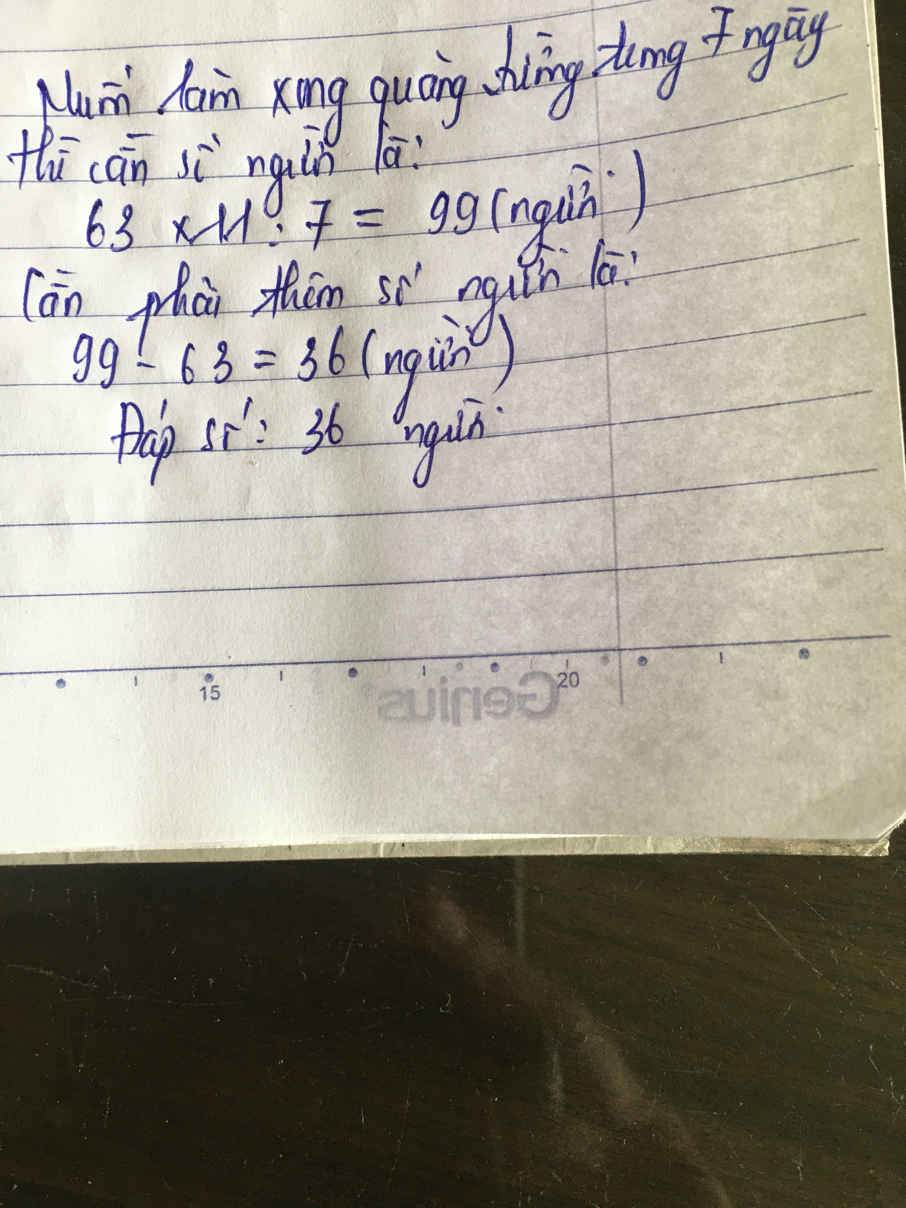 Muốn làm xong 1 quãng đường trong 11 ngày cần 63 người. Hỏi muốn làm xong quãng đường đó trong 7 ngày cần phải thêm bao nhiêu người nữa