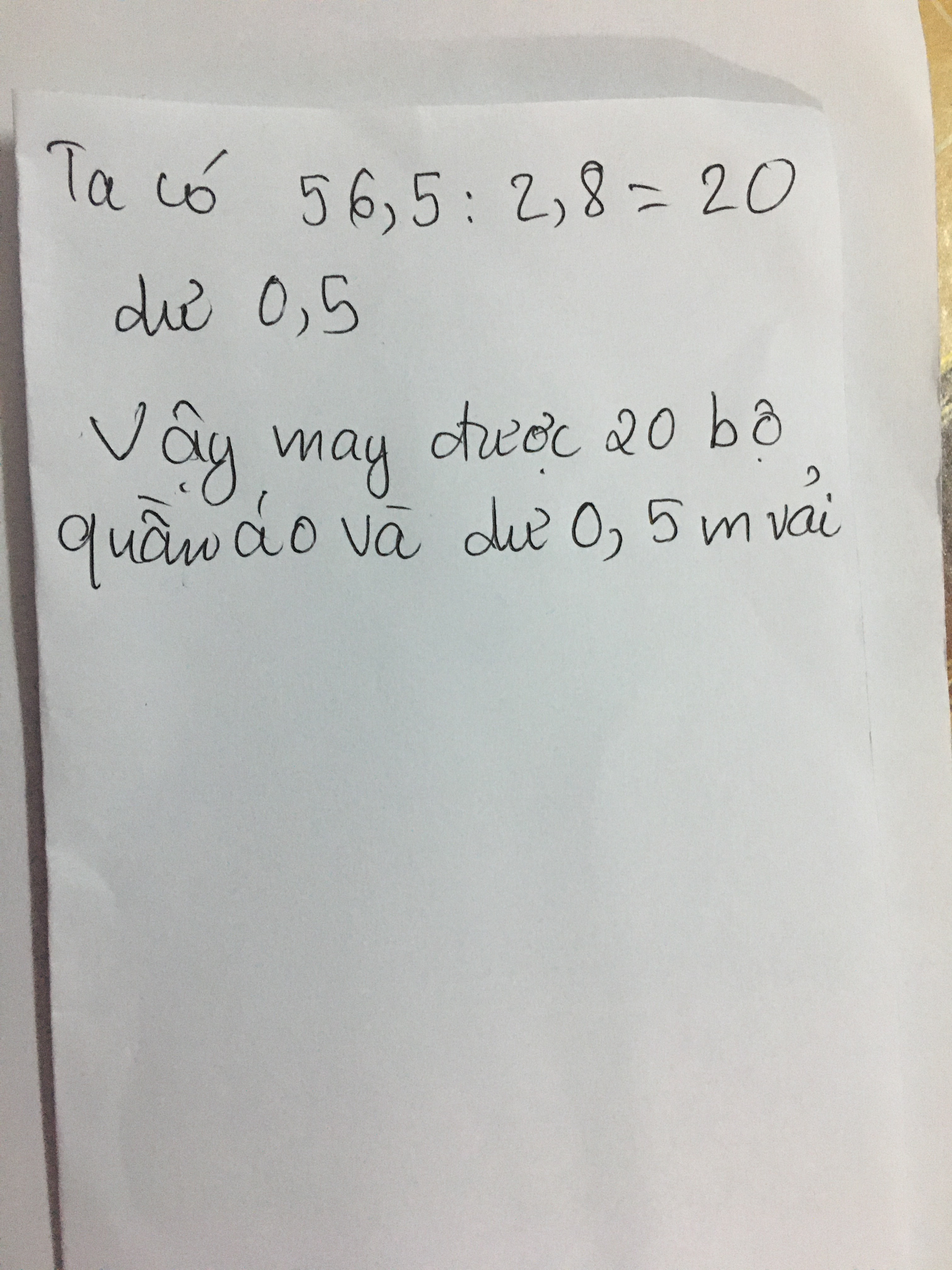 May moi bộ quần áo hết 2,8 mét vải hỏi 56,5 mét vải thì máy được nhiều hơn bộ quần áo vậy thừa bảo nhiêu mét vải