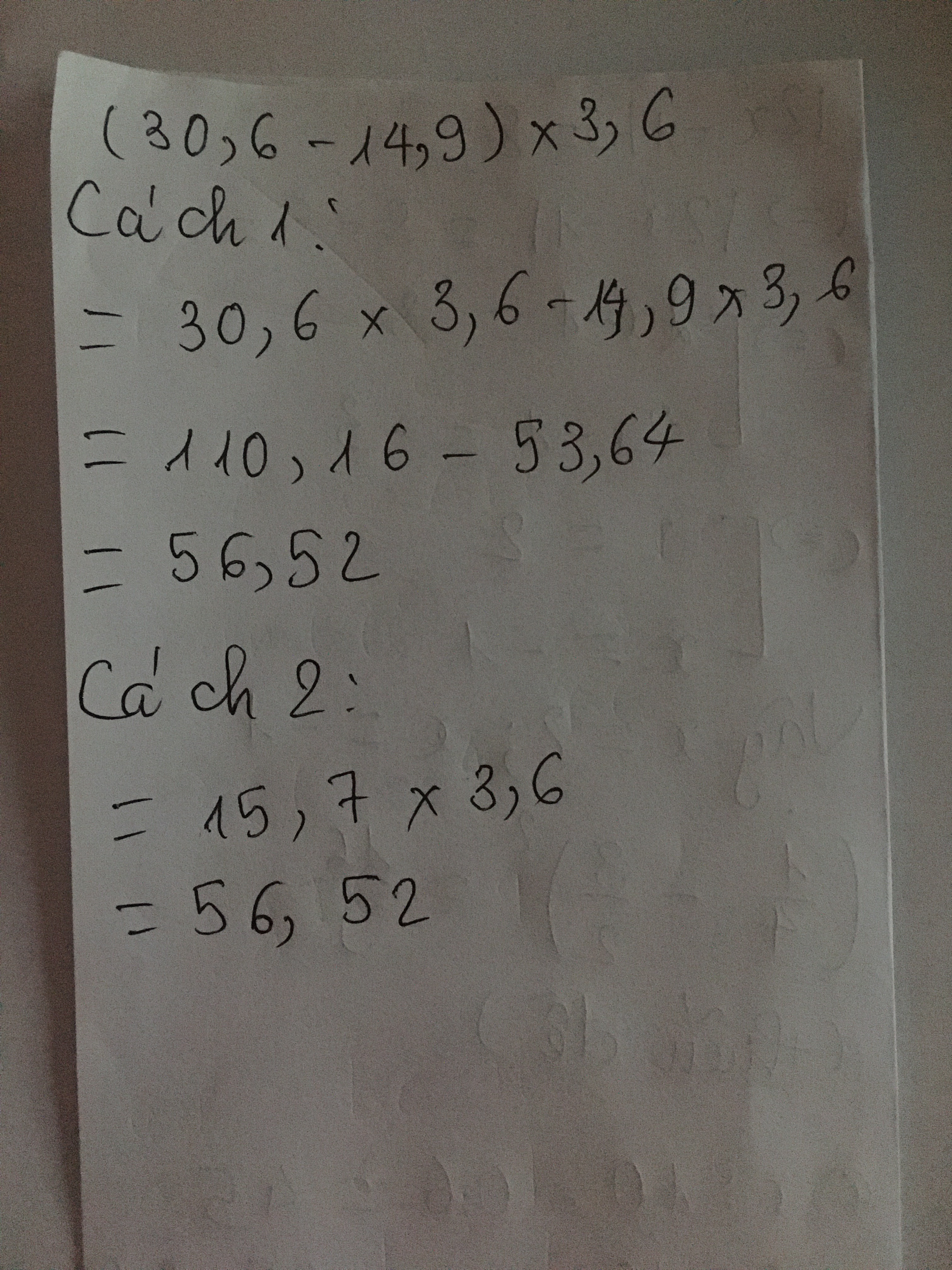 Cách 2: (30,6 - 14.9) 3,6 = 30,6 3,6 - 14,9 3,6 = 110,16 - 53,64 = 56,52
