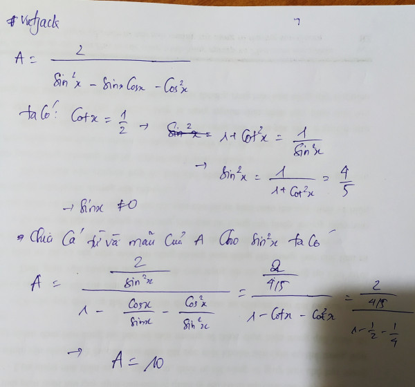 Cho biết cot(x)=1/2.Giá trị biểu thức A=2/sin^2(x)-sin(x).cos(x)-cos^2(x) bằng
