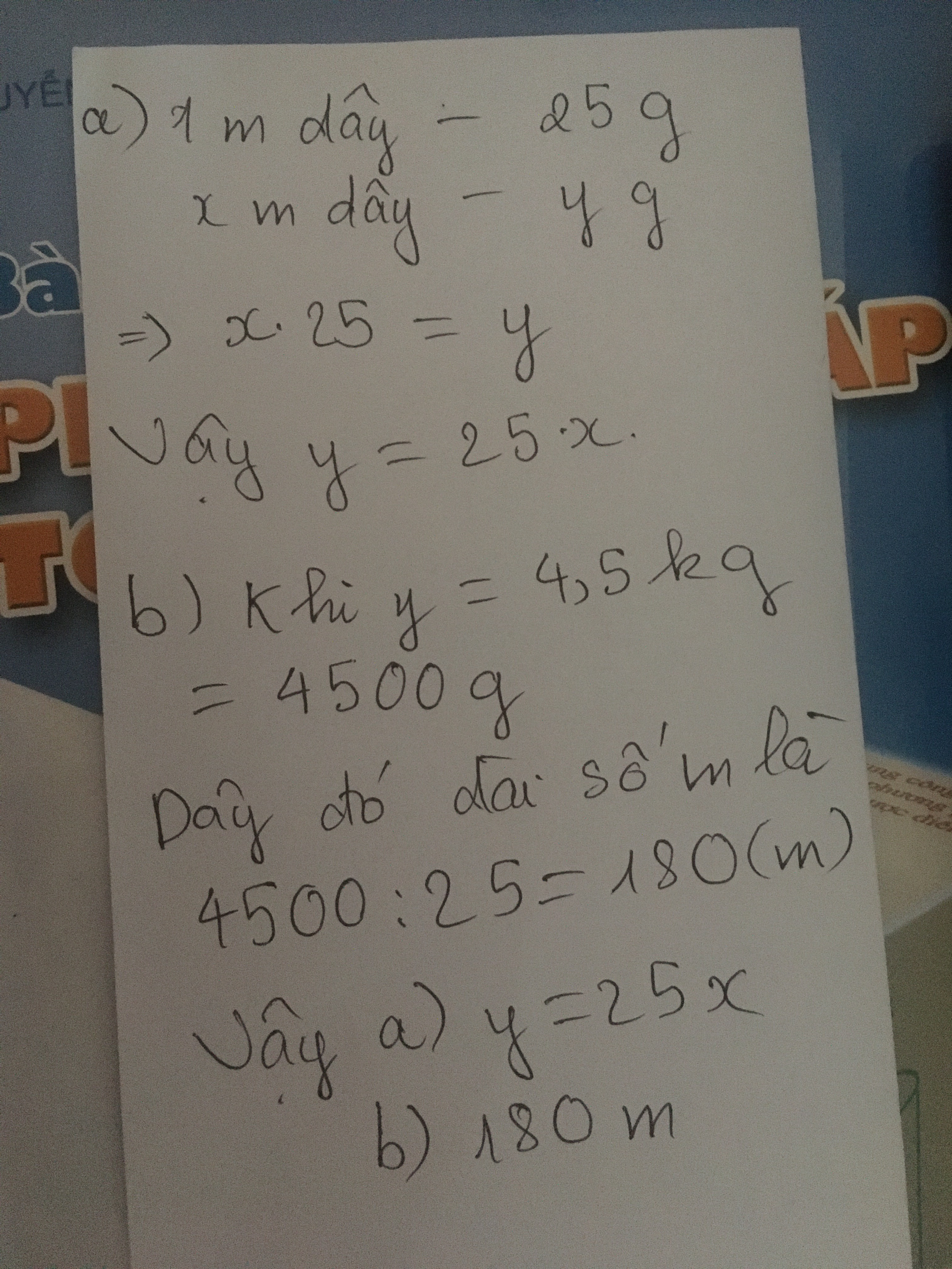 1.Cho biết mỗi mét giây điện nặng 25g.a.Giả sử x mét dây điện nặng y(g).hãy viết công thức viết y theo x.b. Tính chiều dài một cuộc dây điện , cho biết cân nặng 4,5 kg