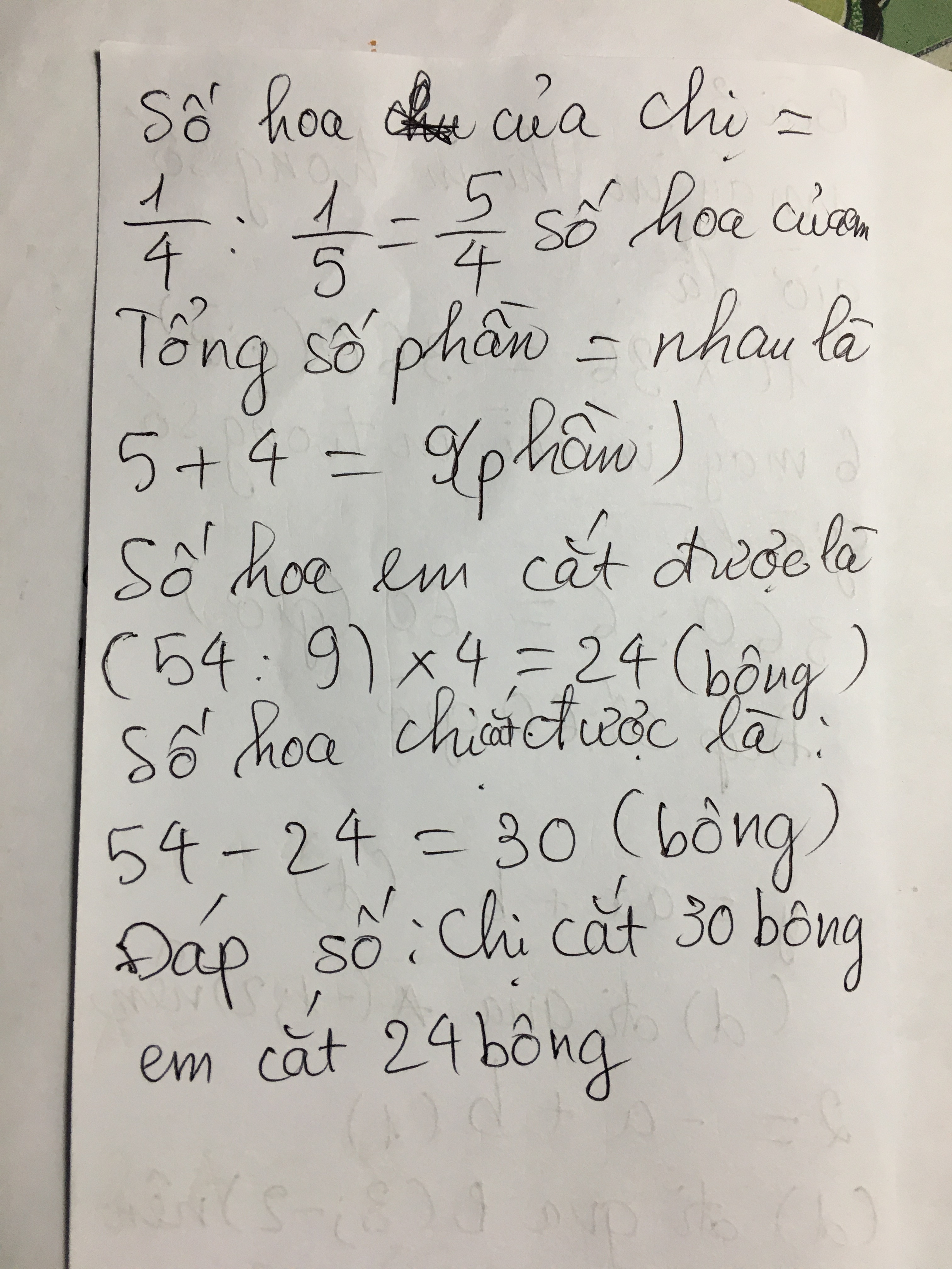 Hai chị e cắt được 54 bông hoa.biết rằng 1/5 số hoa của chị bằng 1/4 số hoa của em.hỏi mỗi chị em cắt được bao nhiêu bông hoa?