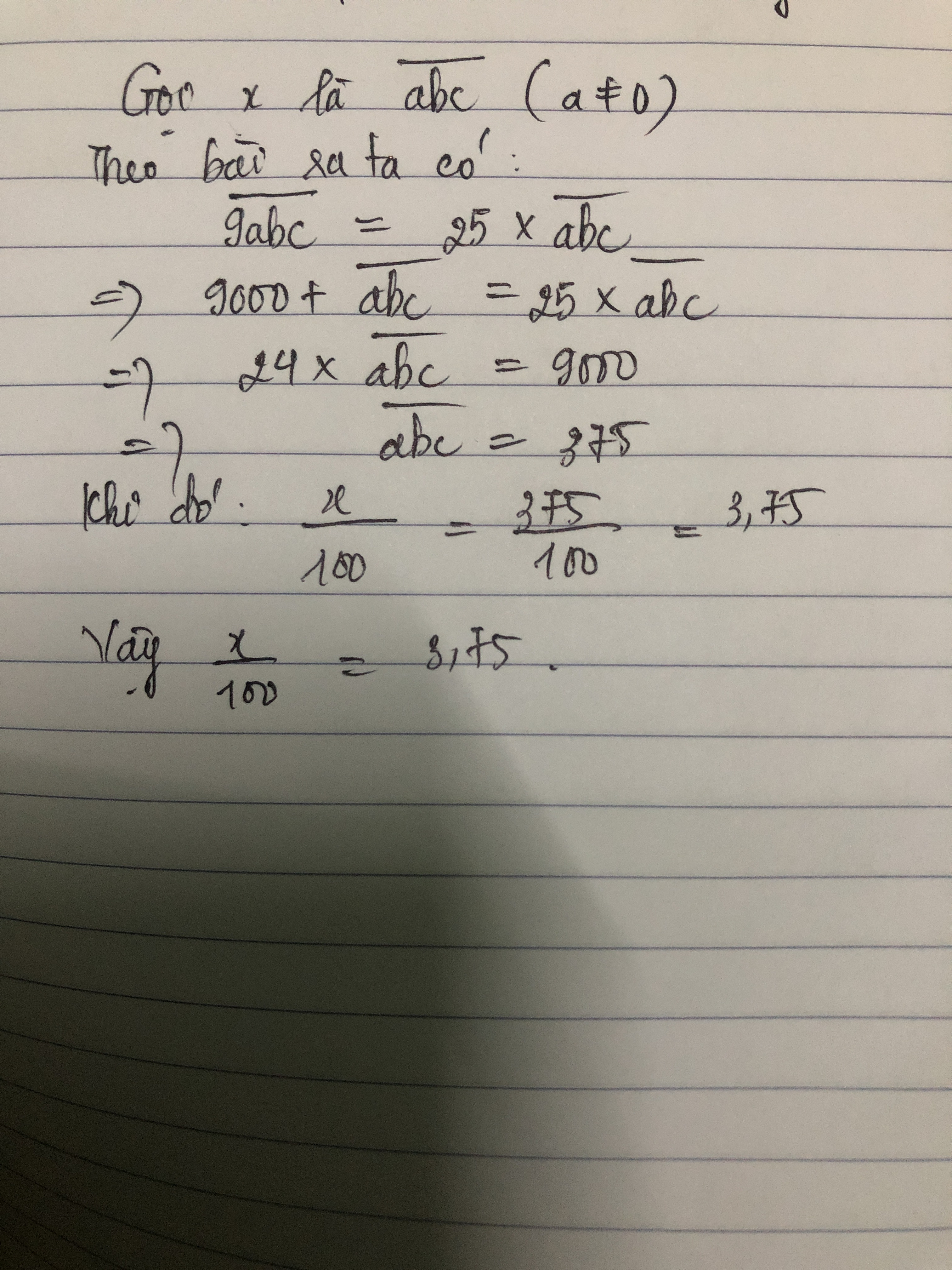 Cho số tự nhiên x có ba chữ số . Biết rằng nếu viết thêm chữ số 9 vào bên trái số đó ta được số mới gấp 25 lần số ban đầu . Khi đó , số thập phân biểu diễn phân số x/100 là