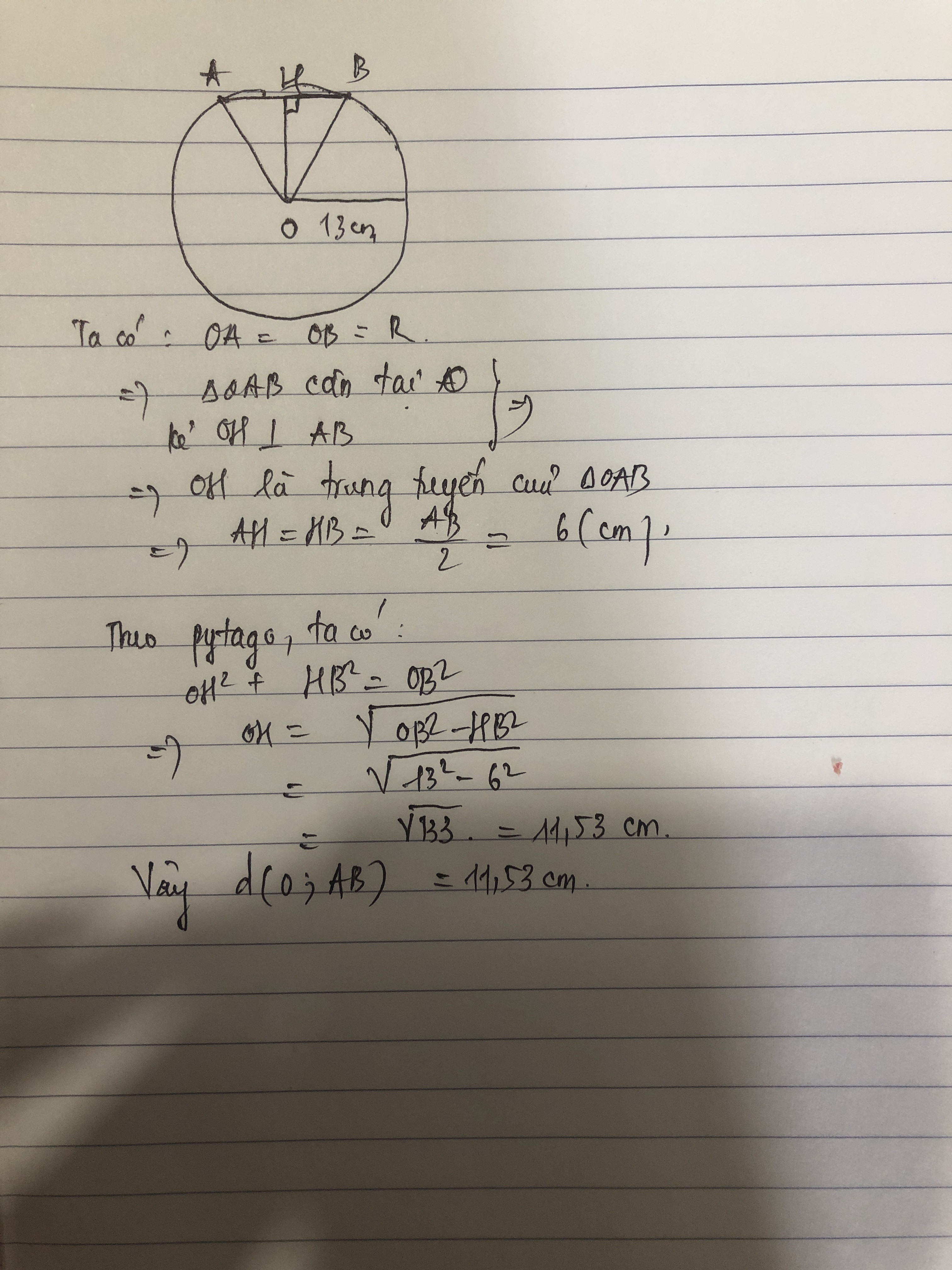 Cho AB là một dây của đường tròn (0;13cm). Biết AB = 12cm, khoảng cách từ 0 đến AB bằng? Giúp với ạ!