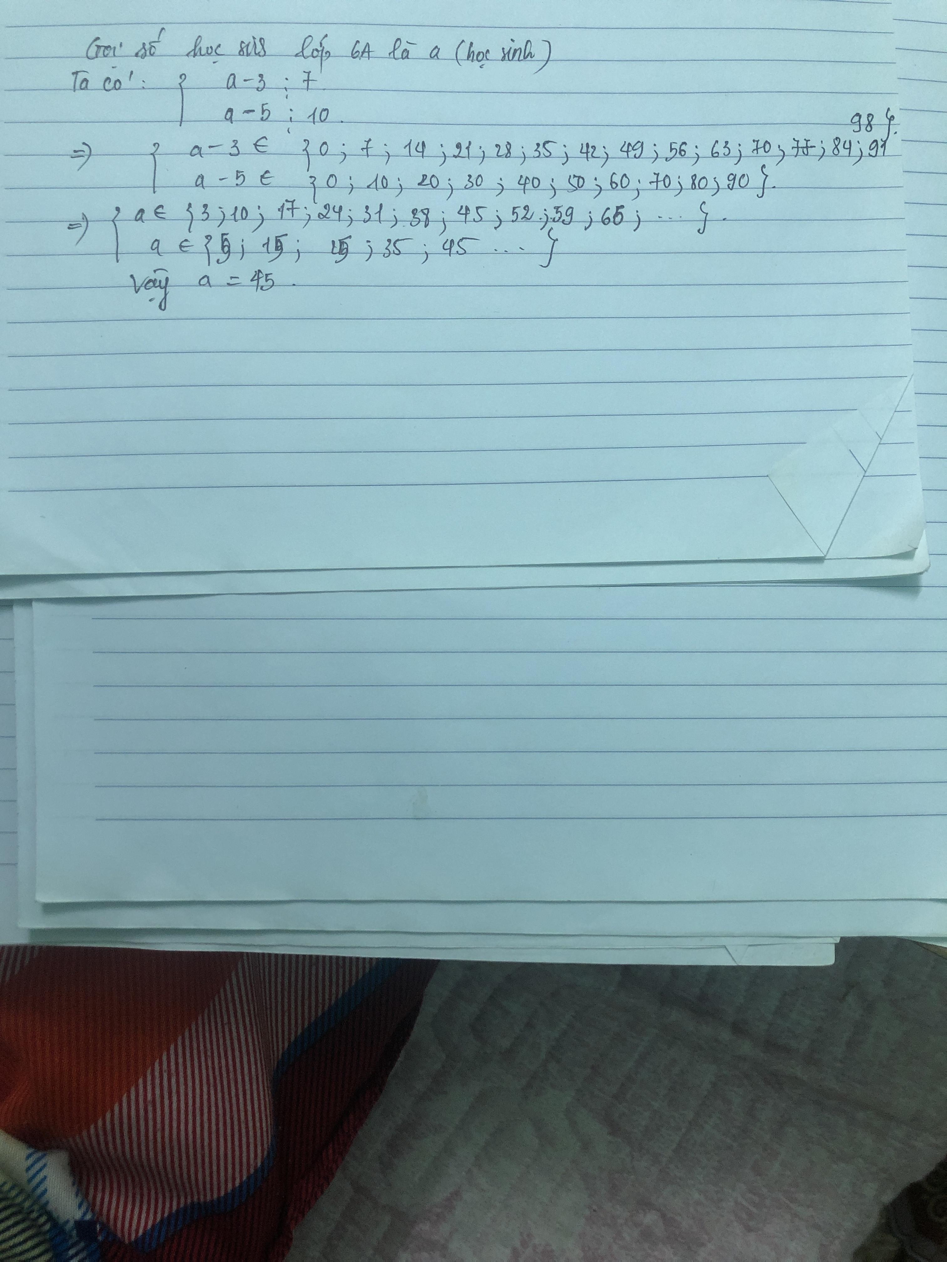 Số h/s lớp 6A ko vượt quá 100 em biết xếp hàng 7 thì dư 3 ,xếp hàng 10 dư 5 .tìm số h/s lớp 6A