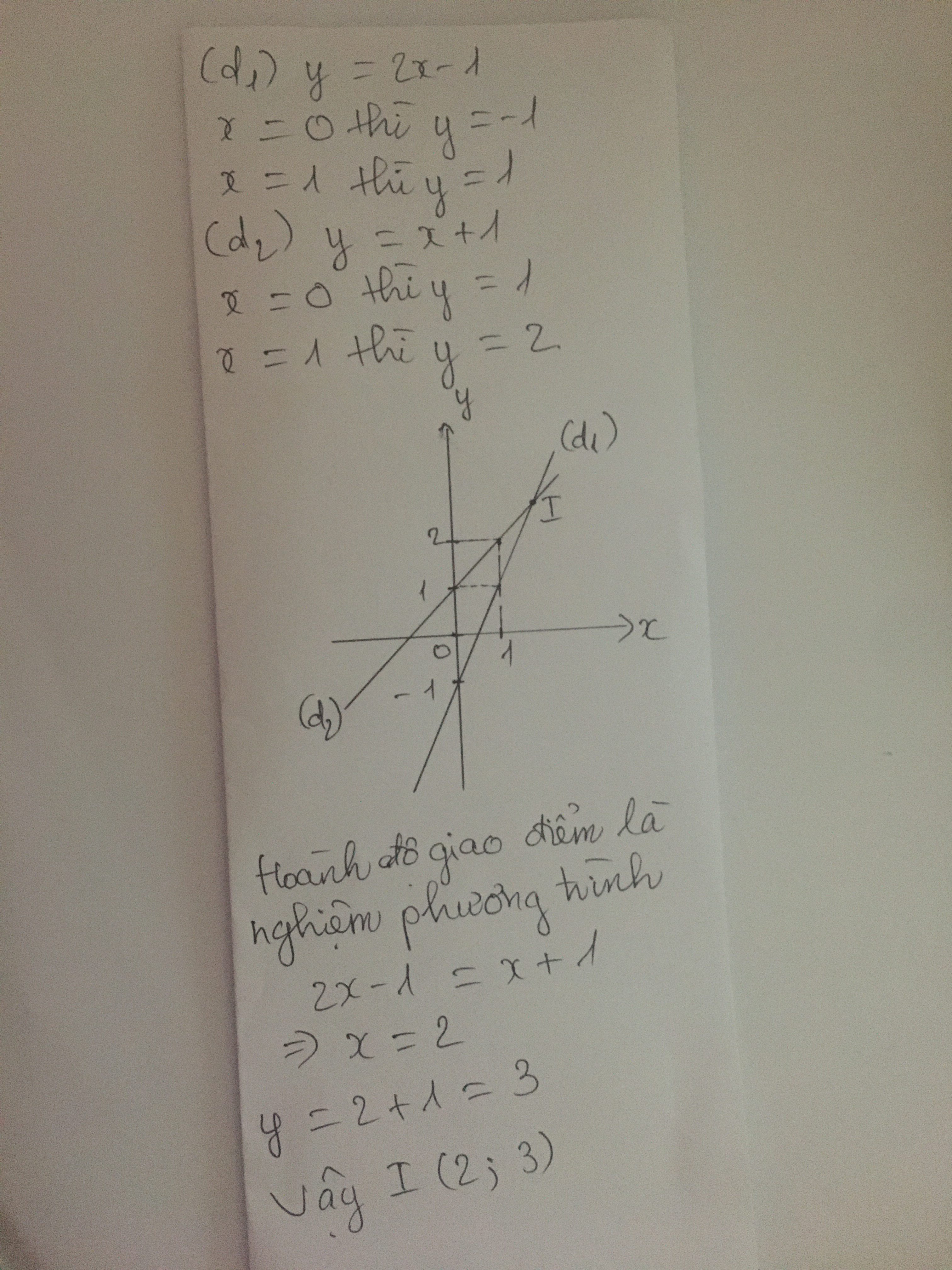 Cho hai hàm số y=2x- 1 có đồ thị d1 và hàm số y=x+1 có đồ thị d2.