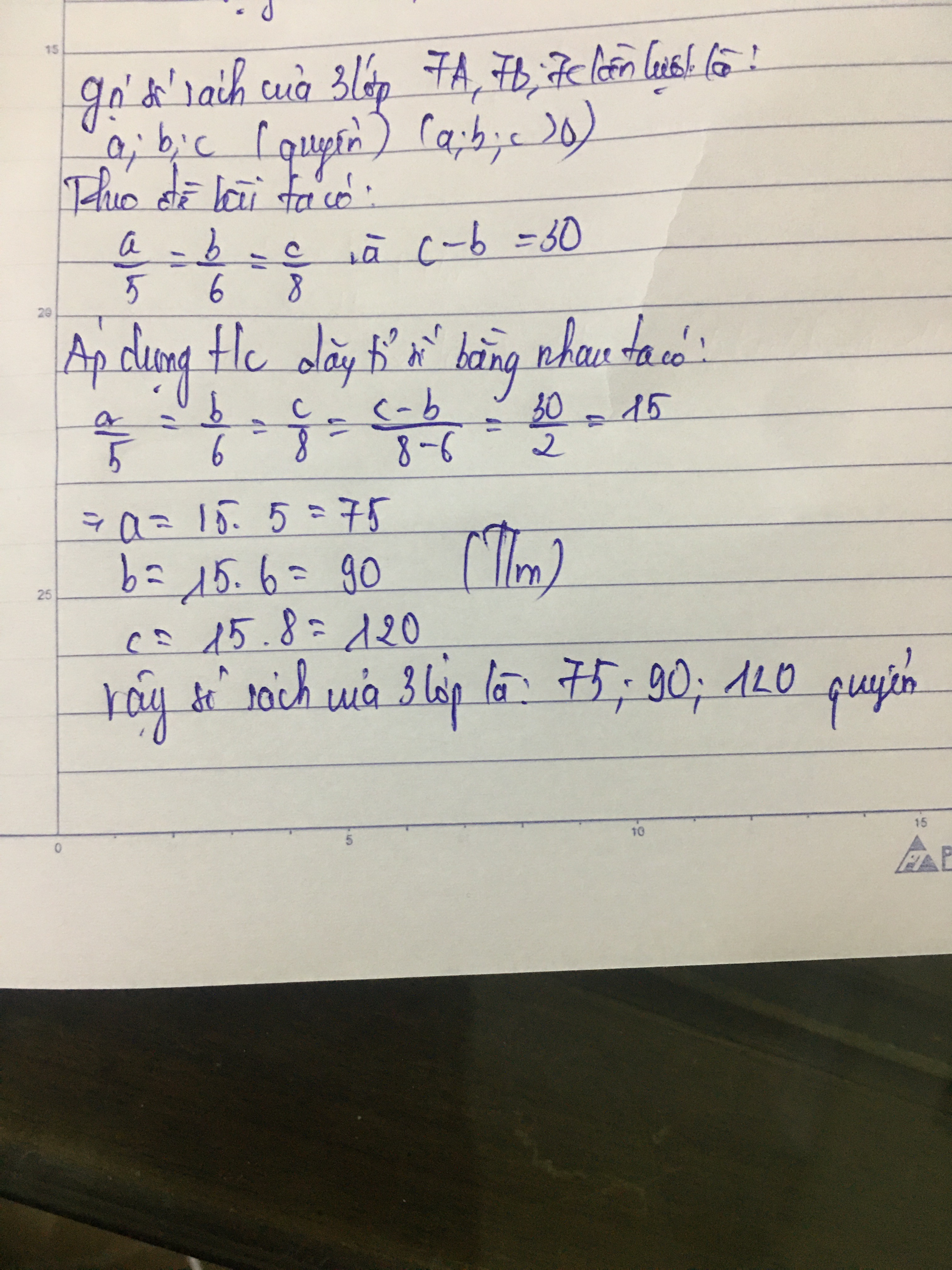 vậy số sách của lớp 7A là 75 quyển; lớp 7B là 90 quyển; lớp 7C là 120 quyển
