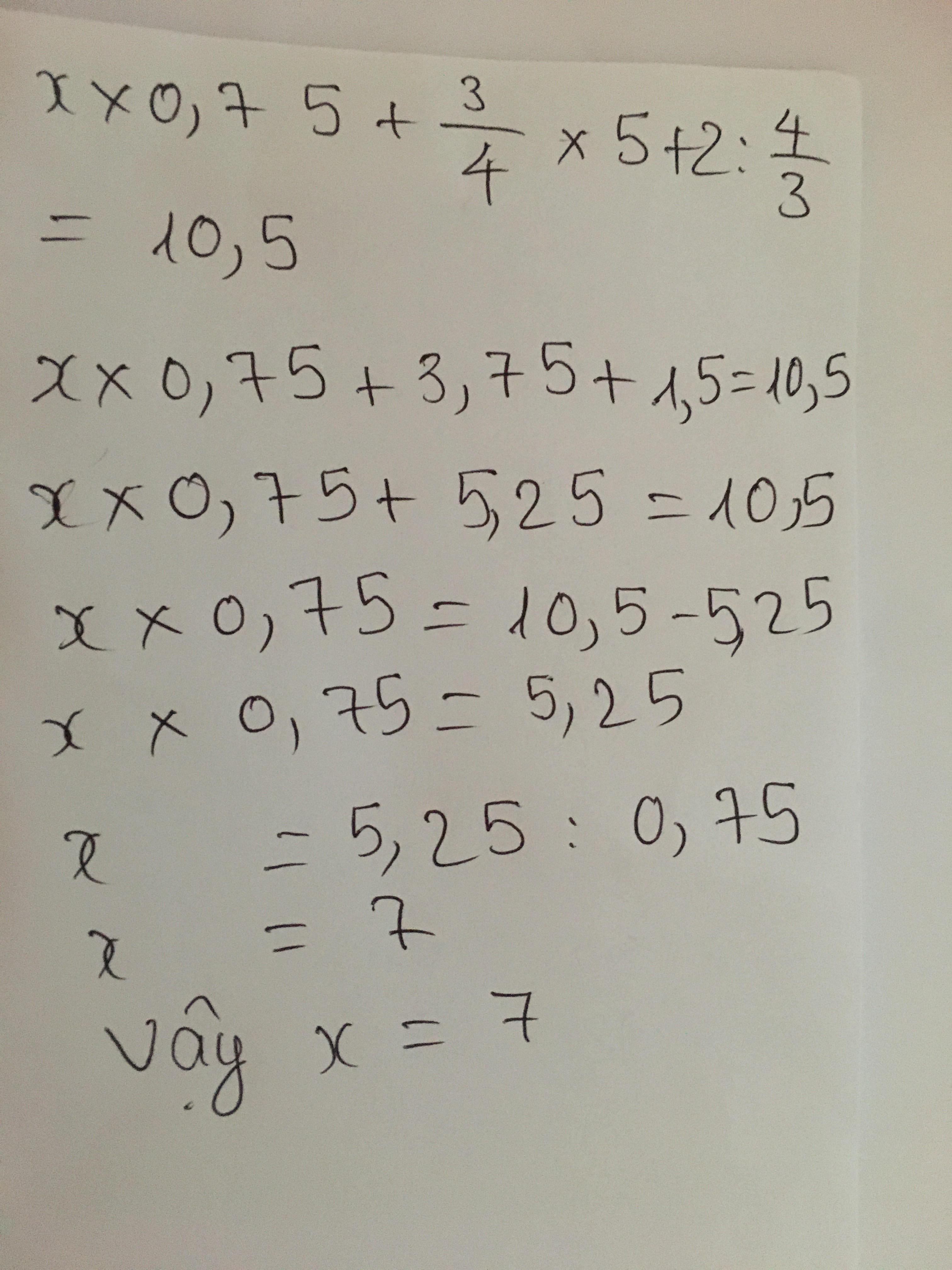 X x 0,75 + 3/4 x 5 + 2 : 4/3 = 10,5