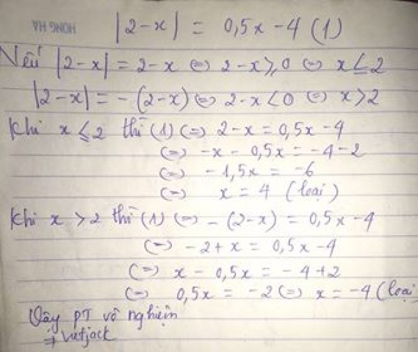 Giải các phương trình: |2 – x| = 0,5x – 4