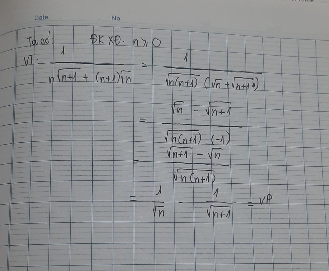 Chứng minh 1/(n căn (n+1) + (n+1)căn n ) = 1/căn n - 1/(căn (n+1)).