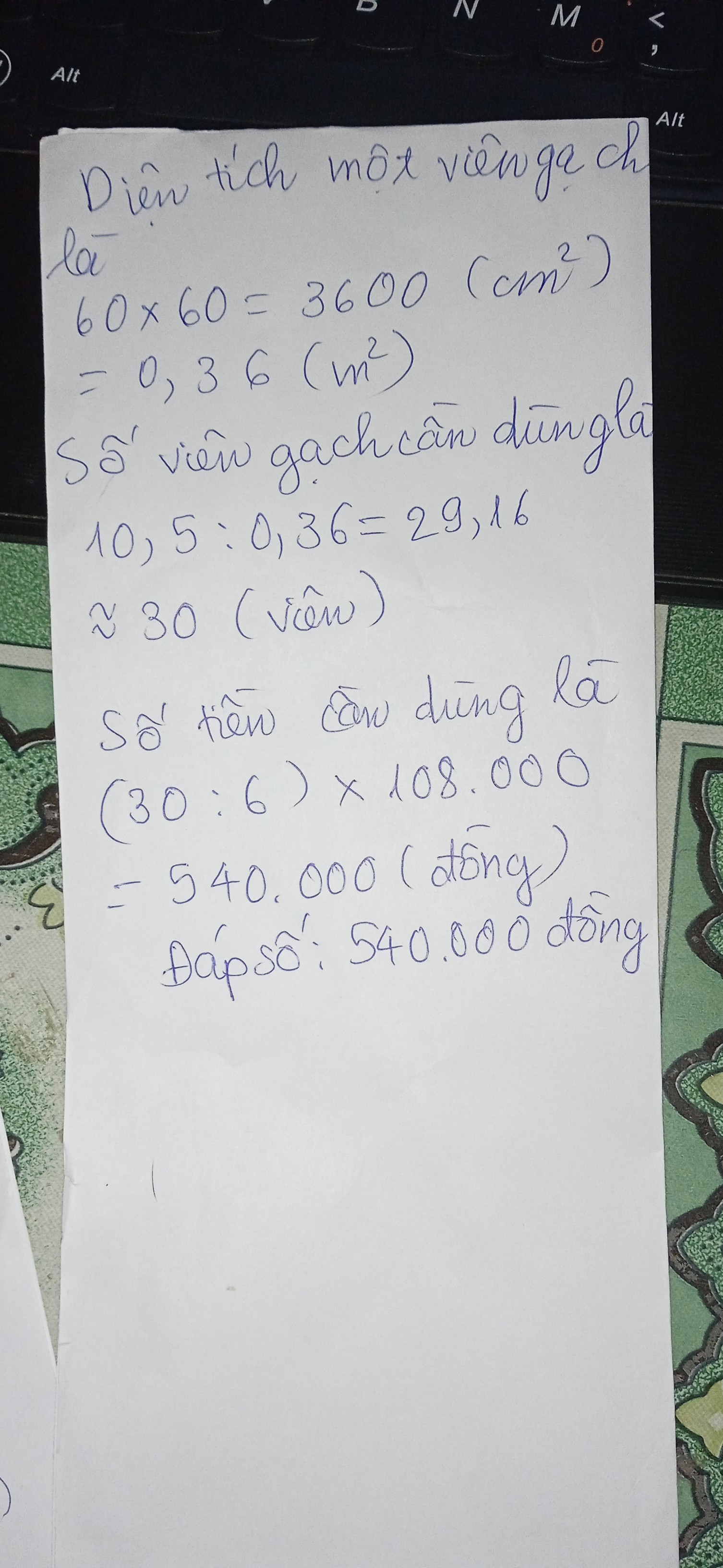 Cho biết một viên gạch lát nền hình vuông có kích thước 60×60cm và một thùng gạch 6 viên cs giá trị 108.000 đồng (cửa hàng có bán lẻ theo viên) . Em hãy tính số tiền mua gạch để lát nền căn phòng. (Biết diện tích căn phòng là10,5m²)