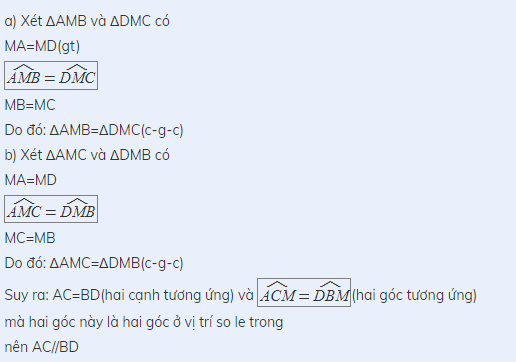 Cho tam giác abc có m là trung điểm của bc,trên tia đối ma lấy điểm d sao cho ma = md . chứng minh tam giác amb=tam giác dmc . chứng minh ac song song với bd
