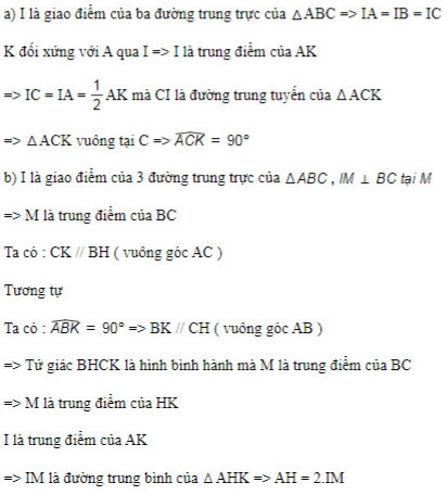Cho tam giác ABC nhọn có ba đường cao AD, BE và CF cắt nhau tại H. Gọi I là giao điểm của ba đường trung trực của tam giác ABC. Kẻ IM vuông góc BC tại M. Lấy điểm K đối xứng với A qua I