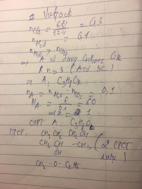 Đốt cháy hoàn toàn 6g chất hữu cơ A thu được 6,72 l khí CO2 ở đktc và 7,2g H2O. Biết A có 3 nguyên tử C. Tìm CTPT của A. Viết tất cả CTCT của A, có mấy CTCT là rượu.