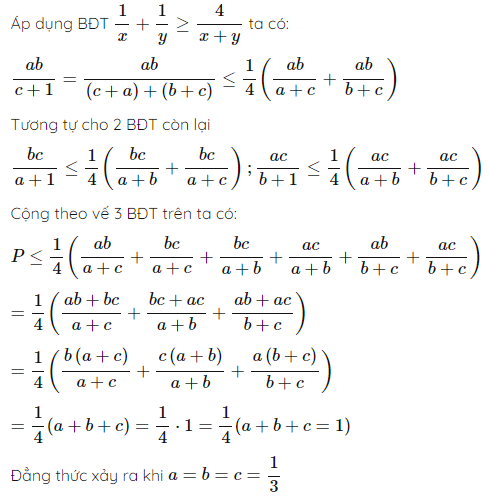 Cho a,b,c0 thoả mãn a+b+c=1. Tìm giá trị lớn nhất của P=ab/(c+1) +bc/(a+1)+ac/(b+1)