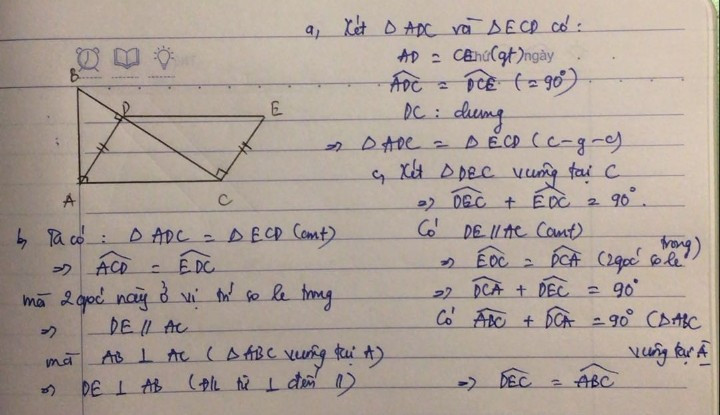 cho tam giác ABC vuông tại a . Kẻ AD vuông góc với BC ( D thuộc BC ). Trên đg thẳng vuông góc với BC tại C lấy điểm e sao cho CE =AD (E và A thuộc hai mặt khác phía bờ chứa cạnh Dc). Chúng minh rằng