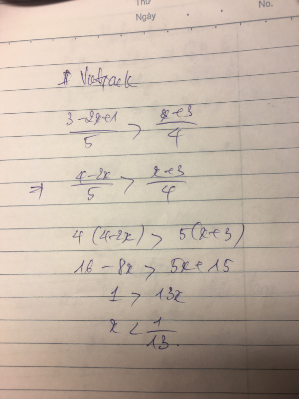 Tập nghiệm của bất phương trình 3-2x+1/5>x+3/4 là