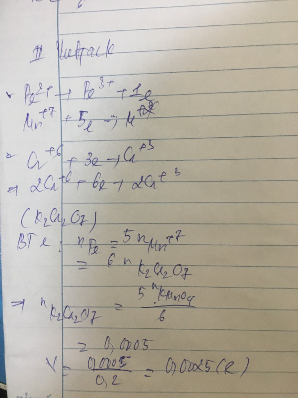 Để chuẩn độ một dung dịch Fe2+ đã axit hóa cần dùng vừa đủ 30ml dung dịch KMNO4 0,02M. Nếu chuẩn độ cùng lượng dung dịch Fe2+ trên bằng K2Cr2O7 0,2M thì thể tích dung dịch cần dùng là