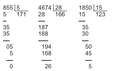 855 : 5, 4674 : 28, 1850 : 15. Nhớ là đặt tính ghi vào phần trả lời luôn nha ![]()