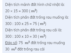 Một mảnh vườn hình chữ nhật có chiều dài 20m và chiều rộng 15m.Người ta đành 25% diện tích mảnh vườn để trồng rau muống,10% diên tích để trồng rau cải.Tính diện tích phần đất trồng rau muống, diện tích phần đất trồng rau cải?