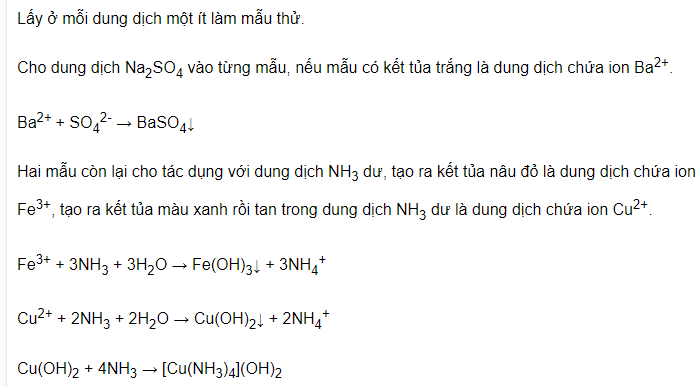 Trình bày cách nhận biết các ion trong các dung dịch riêng rẽ sau: Ba2+, Fe3+, Cu2+.