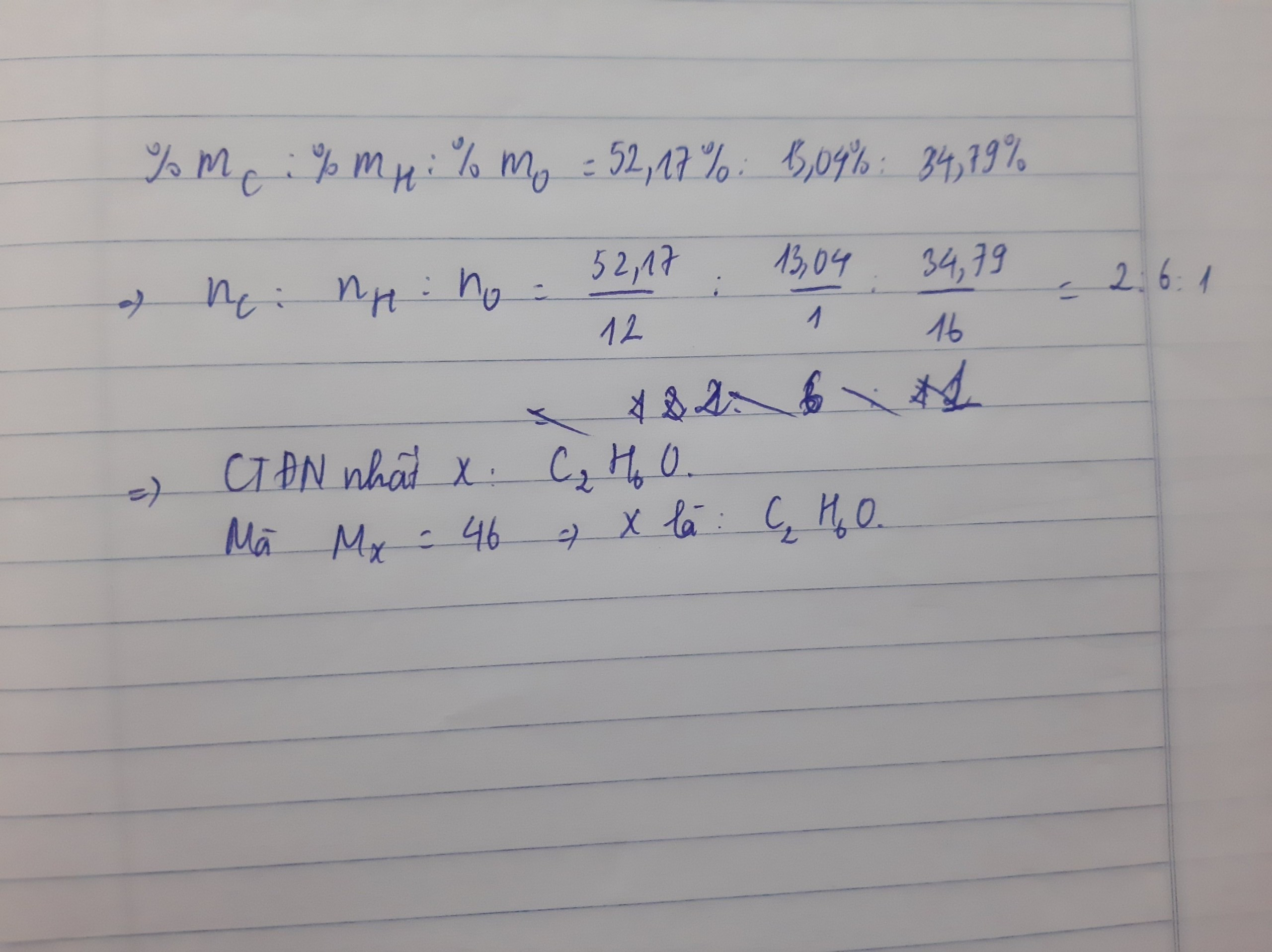 Hợp chất X có phần trăm khối lượng C, H, O lần lượt bằng 52,17%; 13,04% và 34,79%. Khối lượng mol phân tử của X bằng 46. Xác định CTPT của X.