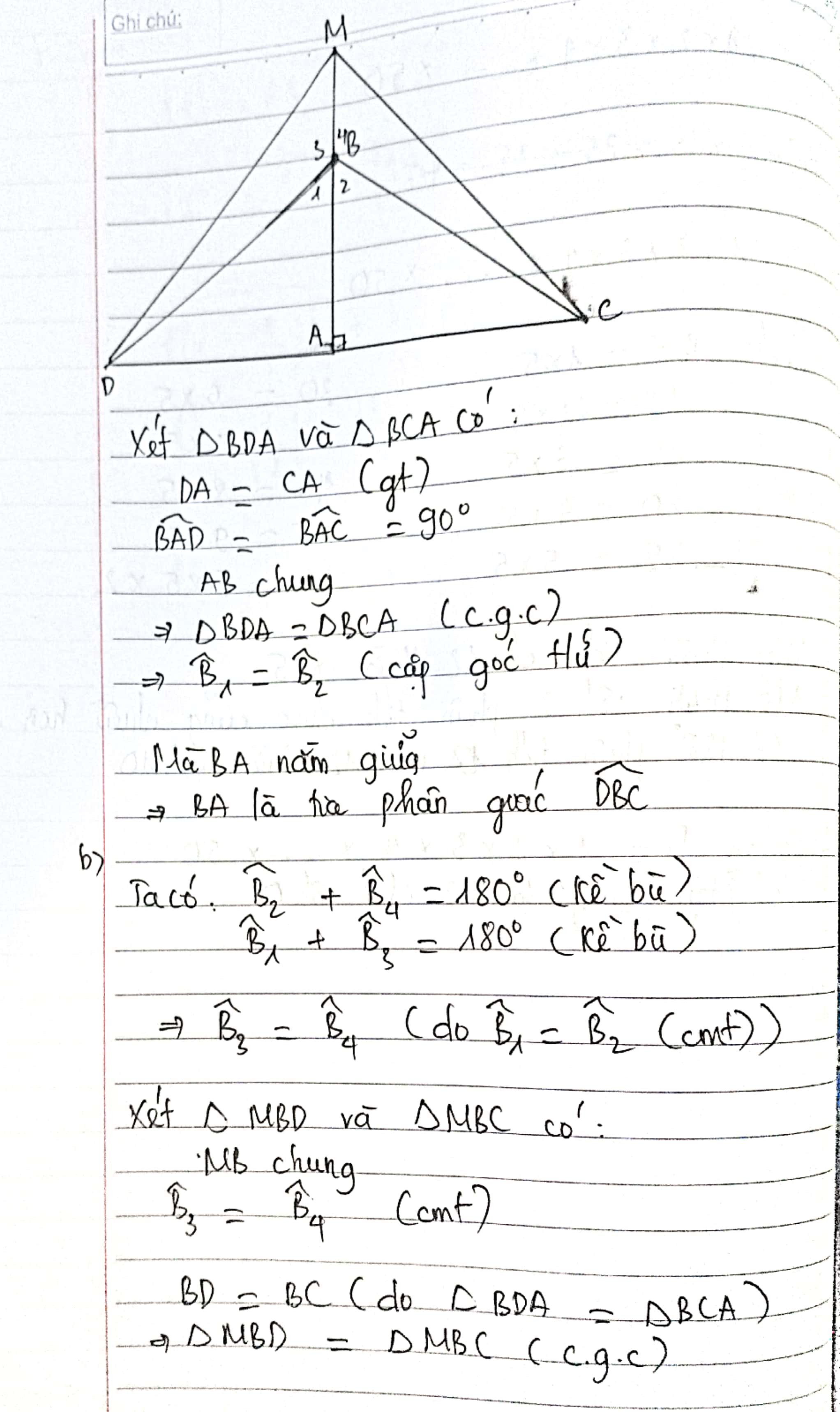 Cho tam giác ABC vương tại A.Trên tia đối của của tia AC lấy điểm D sao cho AC=AD . Trên tia đối của tia BA lấy điểm M bất kì sao cho