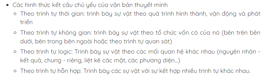 Các hình thức kết cấu của văn bản thuyết minh bao gồm: